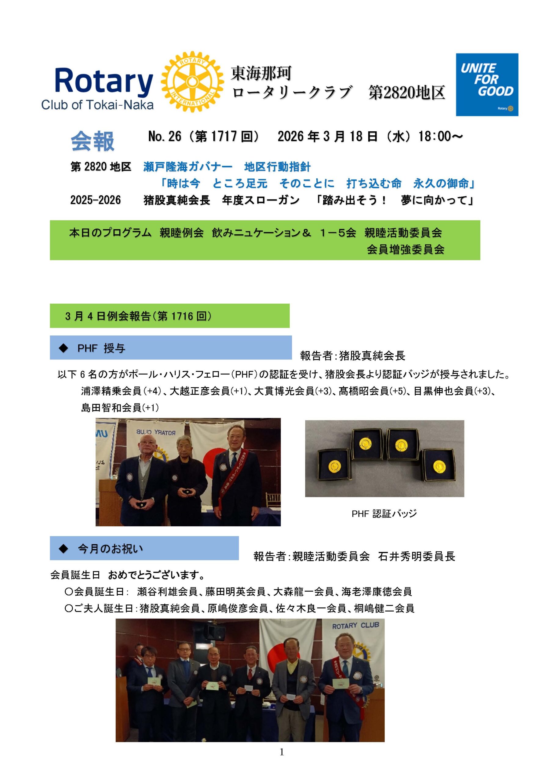東海那珂ロータリークラブに席を置く皆さんに、このクラブに入って良かったと感じてもらうことができ、まだロータリークラブに入っていない皆様には、ぜひこのクラブに入ってみたいと思っていただけるクラブづくりを行ない、みんなの力で社会に奉仕していけるよう取り組んで参る所存ですので、ご指導ご支援をよろしくお願いいたします。