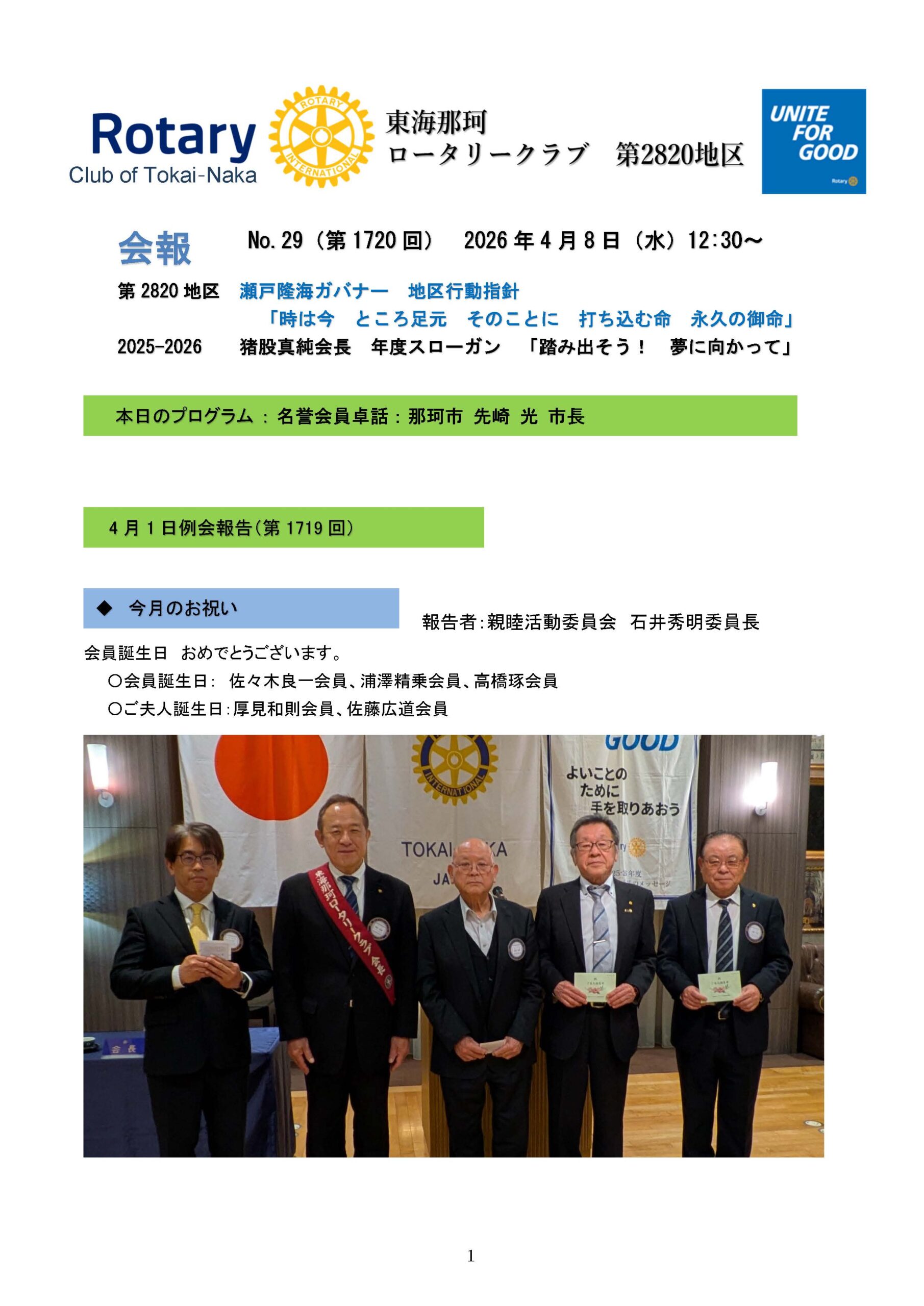 東海那珂ロータリークラブ 2025−26 年度会長を仰せつかりました猪股真純です。